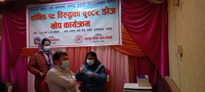 भक्तपुर, माघ ८ । भक्तपुर चेम्बर अफ कमर्सले शनिबार उद्यमी व्यवसायीका लागि कोभिड १९ विरुद्धको बुस्टर डोज खोप कार्यक्रम सञ्चालन गरेको छ । भक्तपुर नपा गपलीस्थित भक्तपुर पार्टी भेन्यूमा सञ्चालन भएको उक्त खोप कार्यक्रममा भेरोसेल खोपको बुस्टर डोज दिइएको हो ।