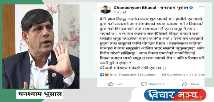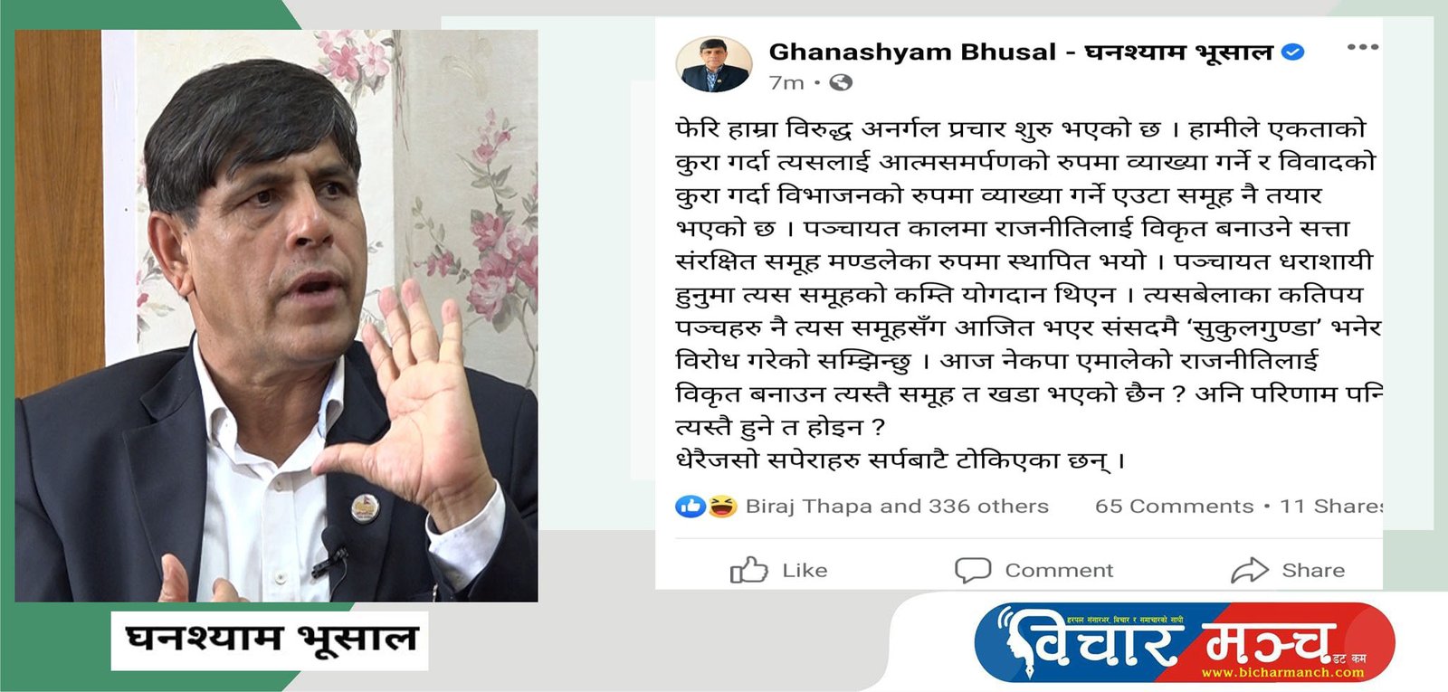 सामाजिक सञ्जाल फेसबुकमार्फत नेता भूसालले आफूहरुकाविरुद्ध अनर्गल प्रचार सुरु गरिएको भन्दै त्यसको धारणा राख्नु भएको हो ।
